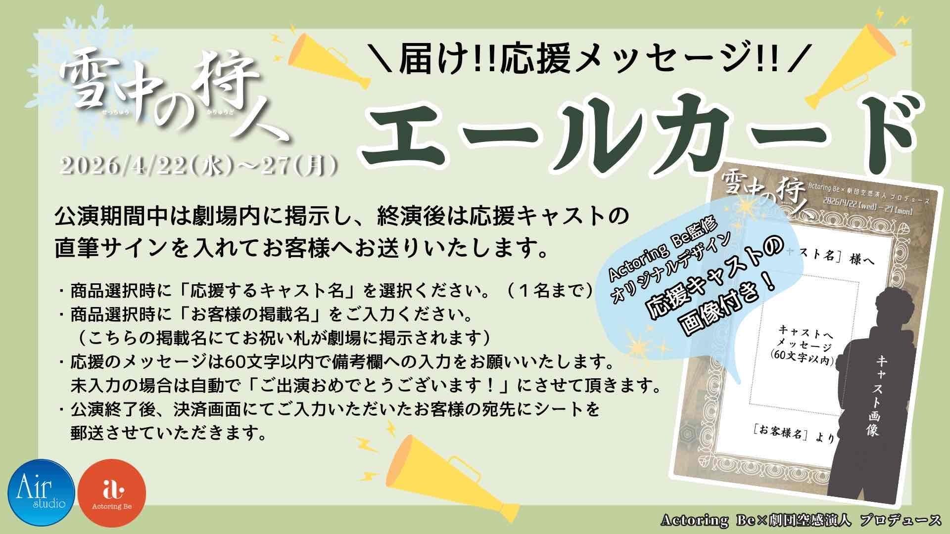 現在、劇場ではお祝い花(スタンド花等)をお受けすることができないため、皆様から出演者への応援を文字にした『エールカード』をご用意いたしました。