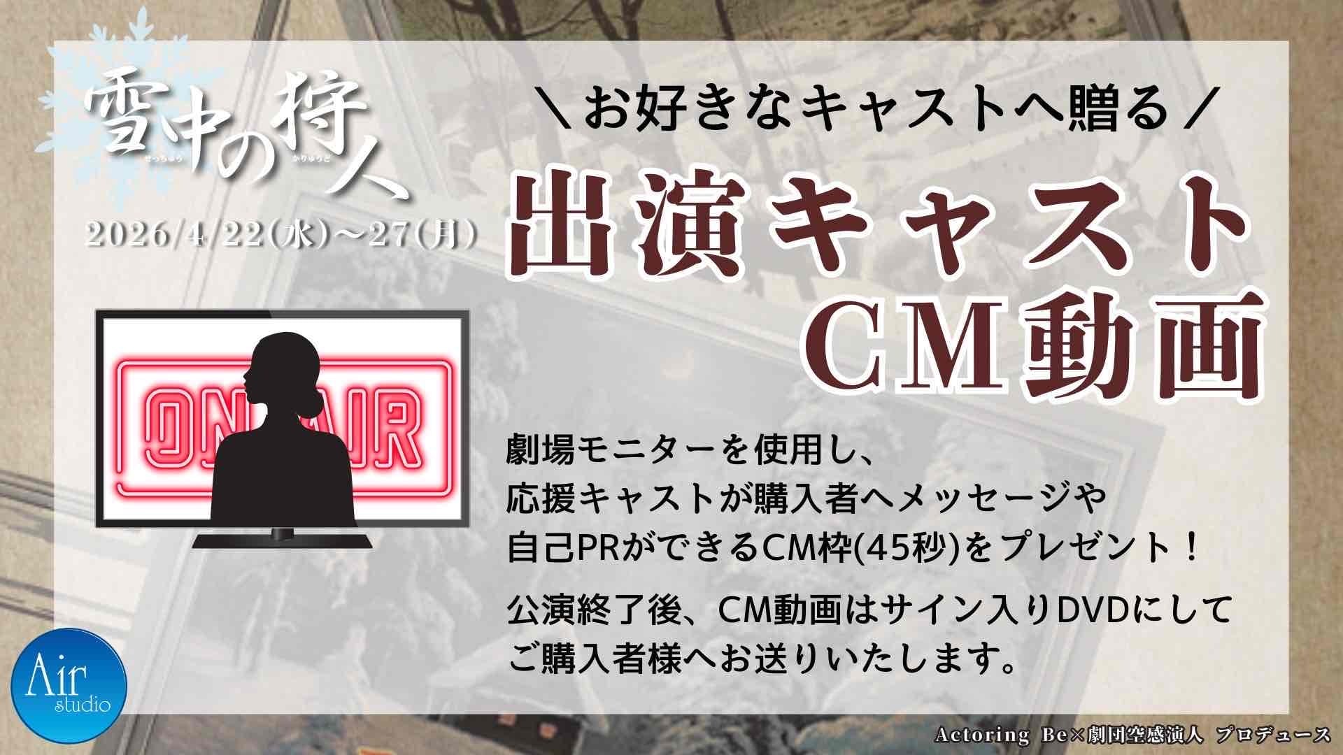 ※公演終演後、決済画面にてご入力いただいたお客様の宛先にCM動画をDVDにして郵送させていただきます。発送目安は、公演終了後1~2週間程度を予定しております。